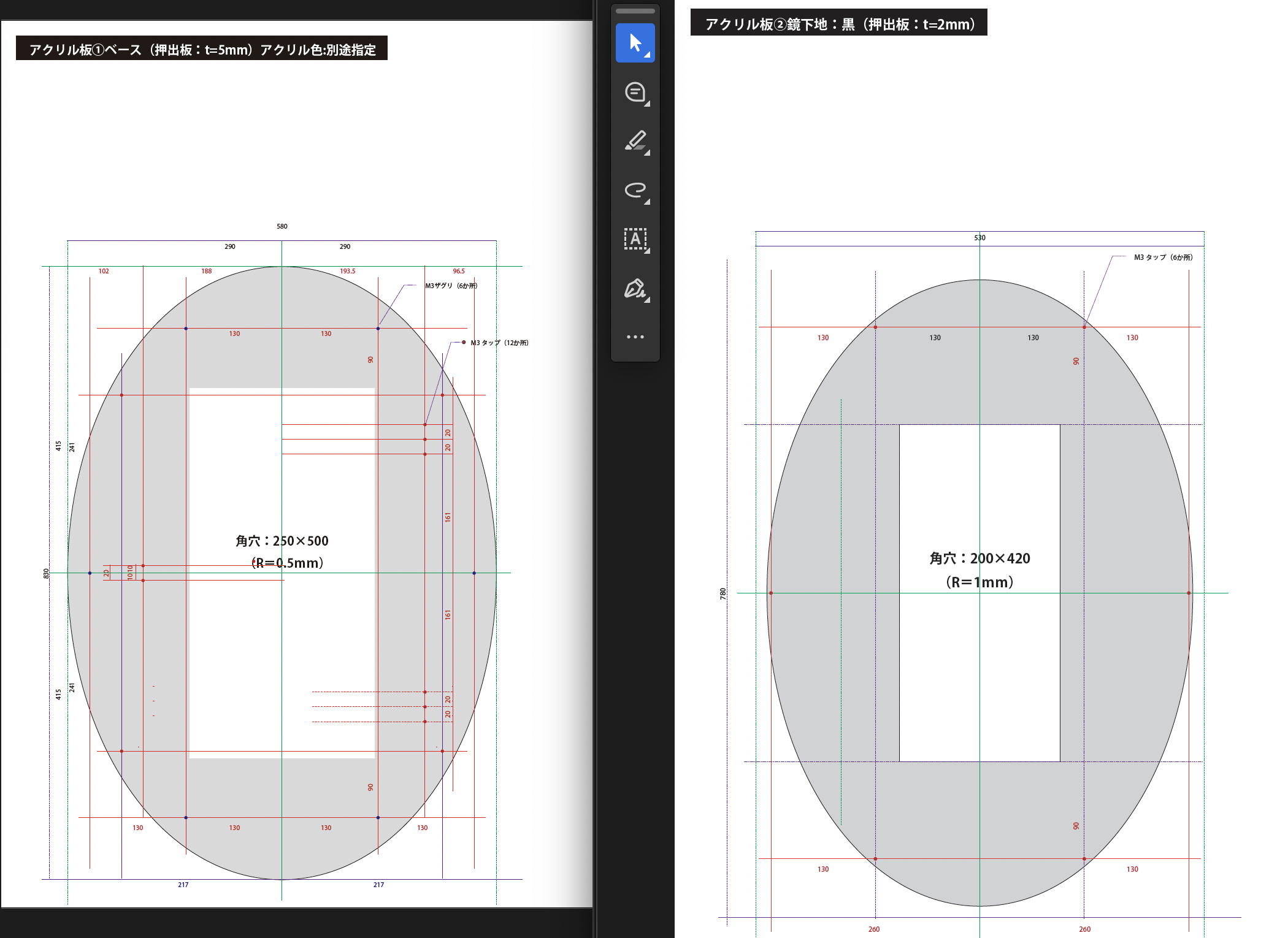 (オーダー)FMオーバルLサイズ(白黒共通図)アクリル加工図① ・FMオーバルLサイズ(白黒共通図)アクリル加工図②
