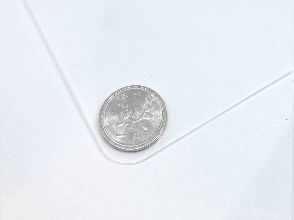 よく利用される4 パターンの R 加工を施したアクリル板に1円玉を置いてサイズ感を比較しました。
